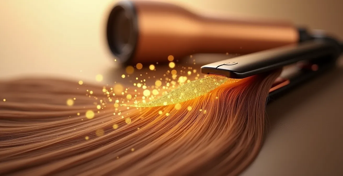 La industria cosmética nos bombardea con soluciones superficiales: sérums que «sellan» las puntas o aceites que aportan un brillo temporal. Pero estos son parches, soluciones estéticas para un problema físico profundo. El verdadero daño no es visible al instante; ocurre a nivel molecular cada vez que una placa de cerámica a 200°C entra en contacto con nuestro cabello. La creencia popular es que el protector crea una barrera impenetrable, como un escudo medieval. La realidad es mucho más sofisticada y fascinante.
